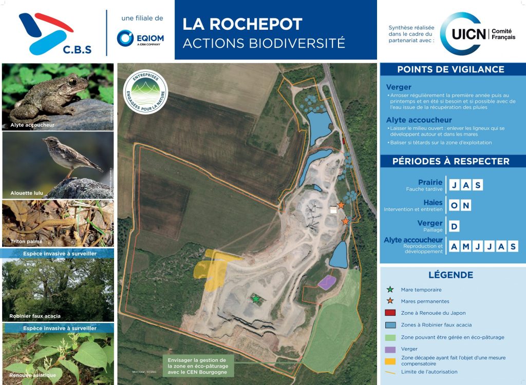 Pour réaliser ces synthèses, EQIOM réunit sur la carrière concernée, le responsable Foncier Environnement et le chef de site, le ou les partenaires biodiversité locaux, le responsable Environnement & RSE de la branche Granulats et le Comité français de l’UICN. Durant toute une journée, tous les participants échangent sur les enjeux et les actions biodiversité de la carrière et sélectionnent les éléments à faire figurer sur la synthèse visuelle qui sera réalisée par le Comité français de l’UICN et validée par l’ensemble des parties prenantes.